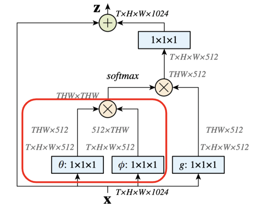 위 그림의 빨간 박스 부분이 similarity를 구하는 부분이다. 각 point 간의 similarity를 구할때 feature map X를 그대로 사용할 수도 있지만( similarity를 구한다는 의미상으로는 이 방법이 더 맞지만), 1x1 convolution으로 projection하여 query map θ와 key map Φ를 생성해 주었다. 이렇게함으로써 학습가능한 weight를 추가해준 것이다.