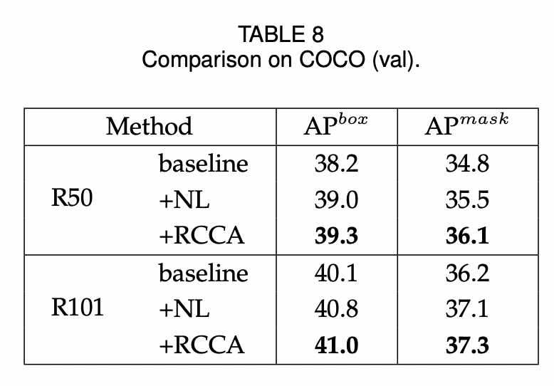 COCO dataset에서 instance segmentation을 보면 NL(Non-local neural network) 보다 성능이 좋은 것을 확인 할 수 있다.